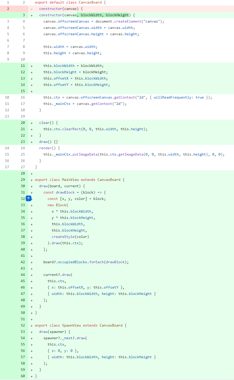 다시 GameManager로 돌아가서 render 메서드를 보면, 공통된 코드들이 조금 보인다. 다음에 나타날 테트로미노를 표시하기 위해 canvas를 하나 더 추가했는데 공통된 작업을 두번씩 하고 있는게 보인다. 게다가 조금 생각해보니 GameManager에 Canvas API에 대한 세부사항을 알고있는것이 조금 마음에 안든다. 이걸 모두 옮겨보자. Commit