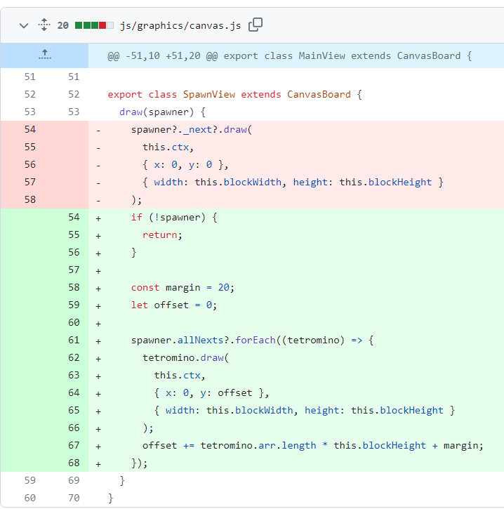 확인해보니 블럭이 이상하게 보인다. 분명 블럭은 3개 잘 생성되었고, 그리는쪽에 문제가 생겼으니 아까 분리했던 SpawnView로 가보자. 지금 다음 블럭은 세로 레이아웃으로 보여주고 있다. 그러니 적절히 오프셋을 지정해서 다음 블럭들을 세로로 그려주도록 하자. Commit