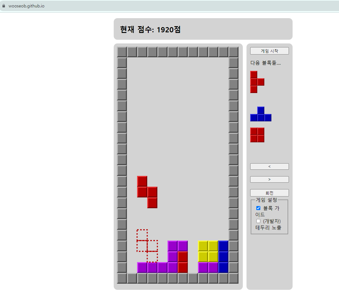 - 스페이스 바 : 테트로미노 바닥까지 바로 내려보내기